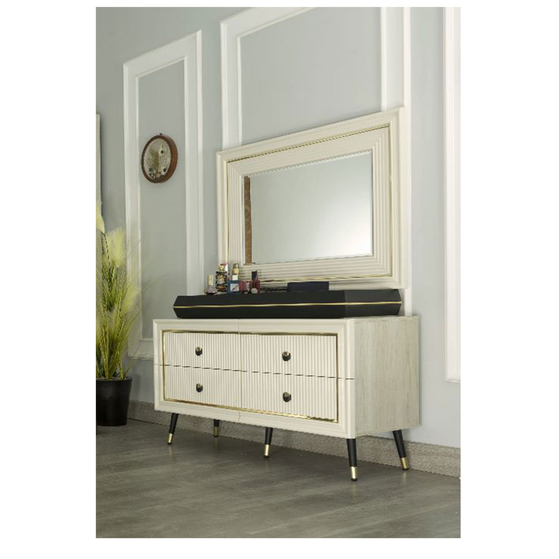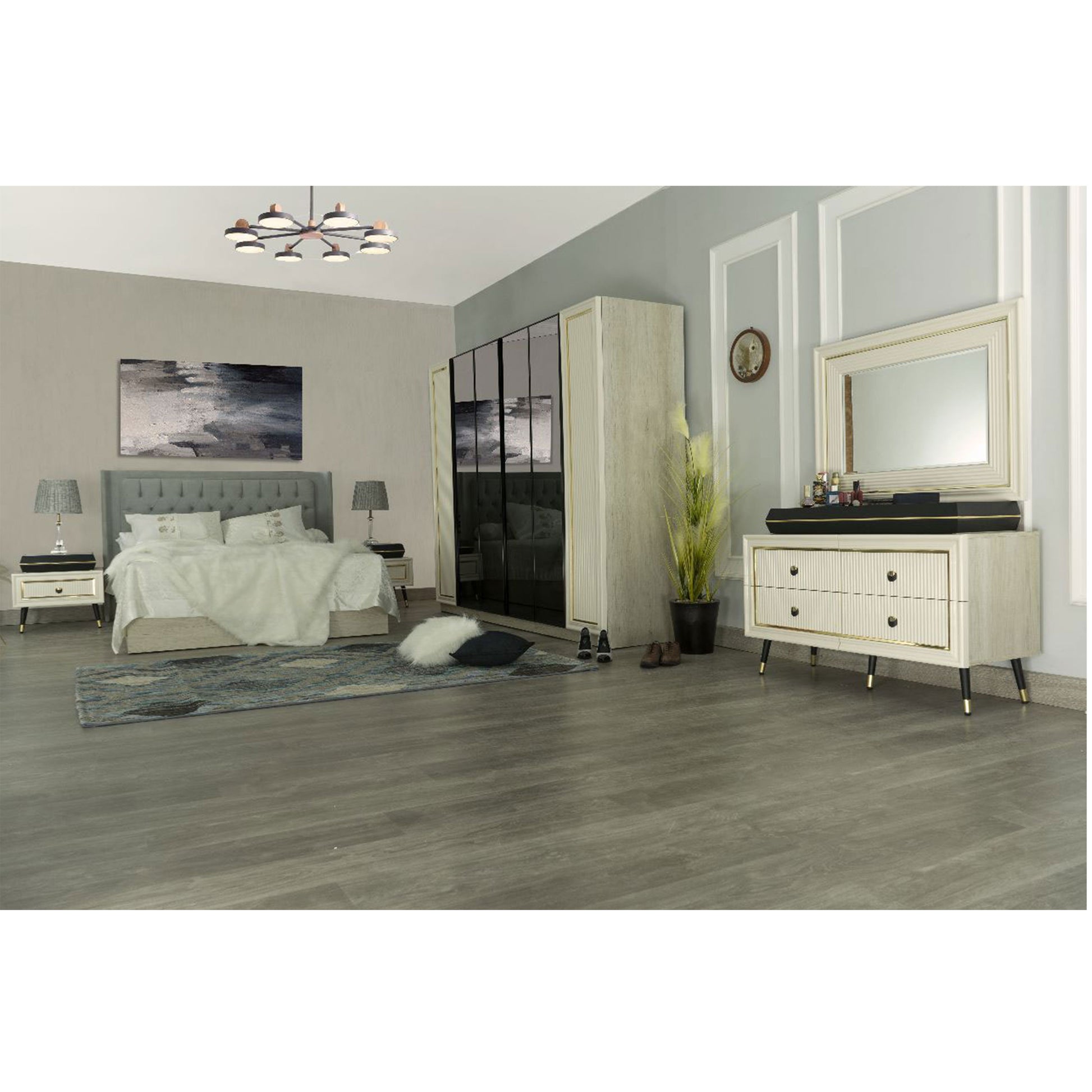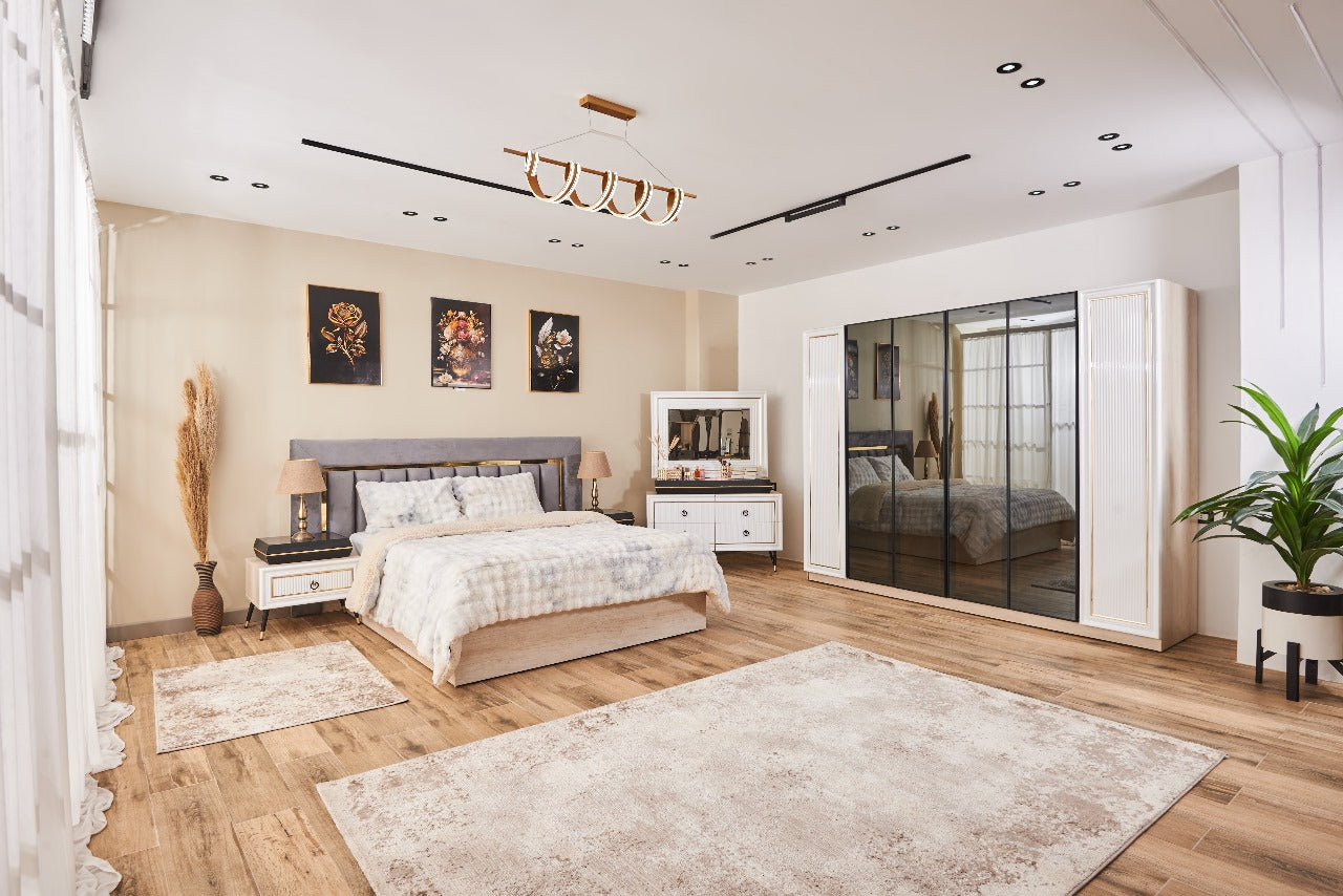 غرفة نوم ميراج (ألواح MDF) – سرير 160 سم، تسريحة 120 سم، 2 كمود 60 سم، دولاب 260 سم