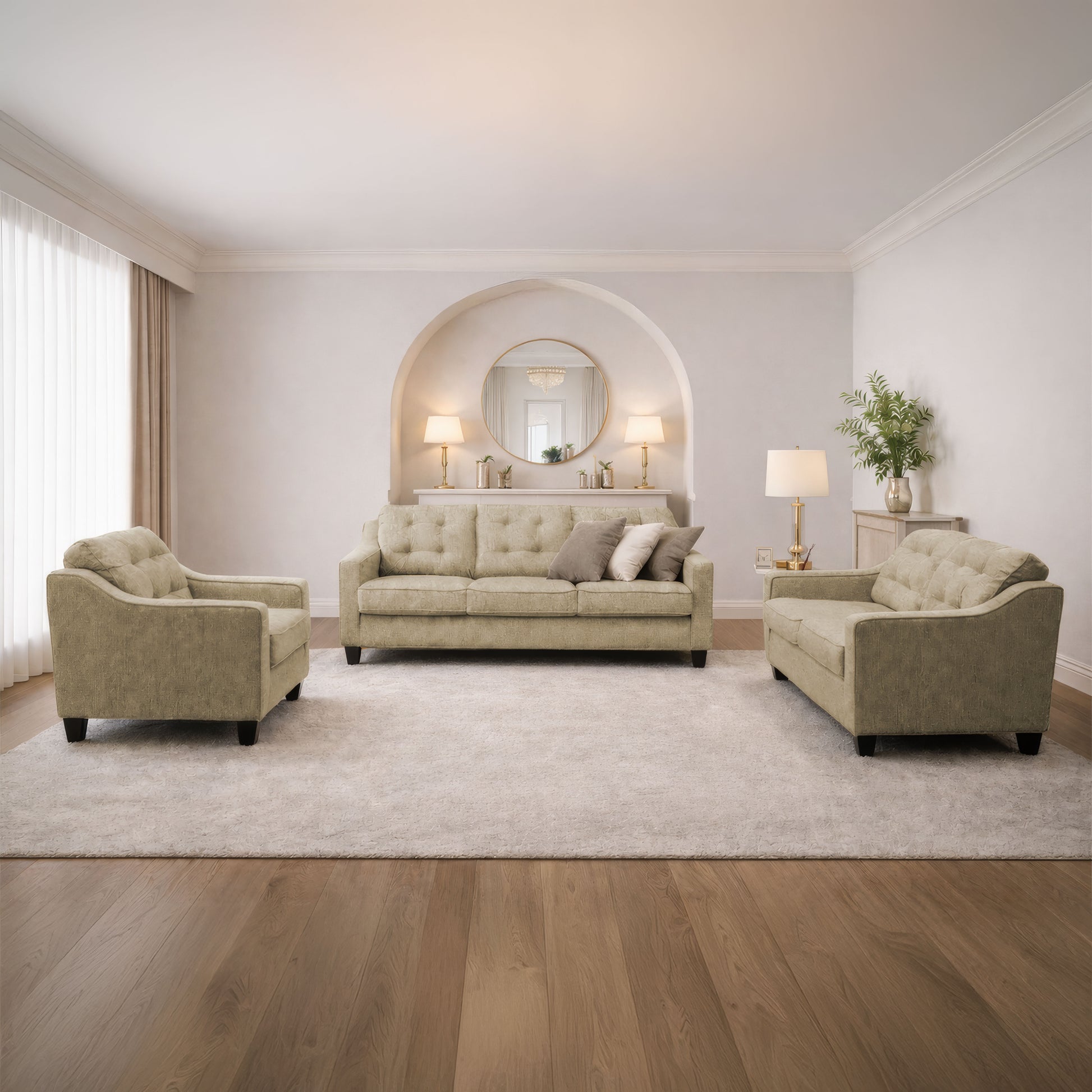 حوّل غرفة معيشتك مع طقم انتريه موأنا المكوّن من 3 قطع، الذي يجمع بين التصميم العصري والتفاصيل الأنيقة. يتميّز بتنجيد قماش بيج مُكبَّس مع وسائد مريحة تمنح أقصى درجات الراحة. يضم الطقم كنبة 3 مقاعد، كنبة 2 مقعد، وفوتيه، ليكون خيارًا مثاليًا للاسترخاء واستقبال الضيوف.
