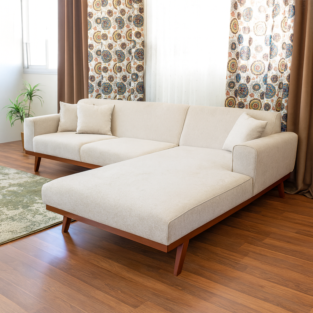 ركنة منزلية مودرن على شكل حرف L (خشب صنوبر، أبلكاش) – لون بيج فاتح – تسلا