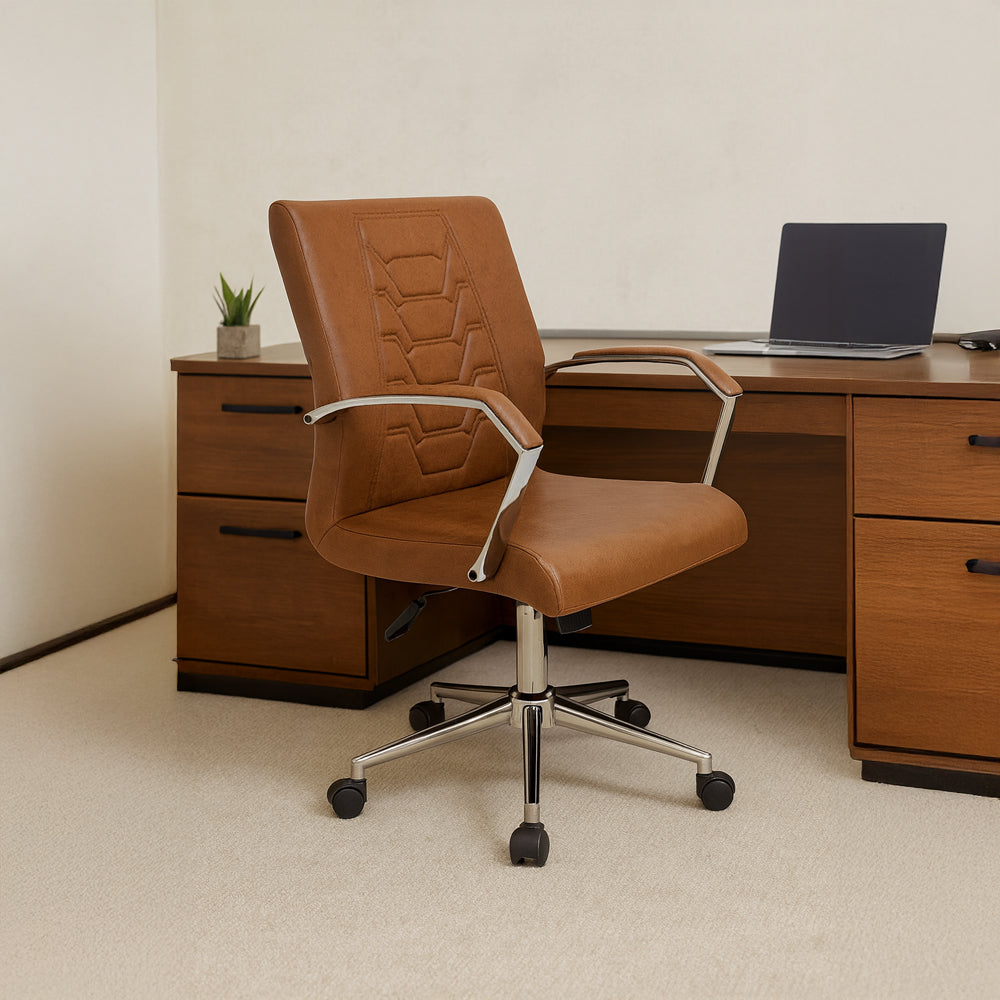 كرسي رويال متوسط الظهر يجمع بين التصميم العصري والوظيفة المريحة. يتميز بنمط تطريز هندسي على مسند الظهر وقاعدة تركية أنيقة من الكروم، ليضفي لمسة من الاحتراف والراحة على أي مساحة عمل.