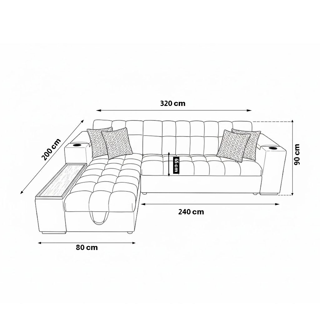ركنة منزلية مودرن على شكل حرف L – رمادي غامق مع ترابيزة مدمجة وحوامل أكواب – وندر