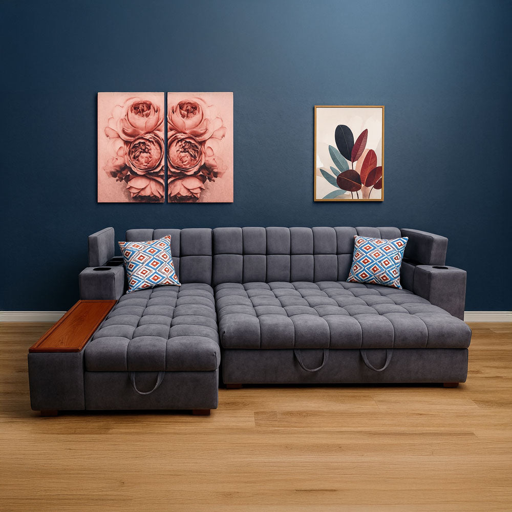 مُنجدة بقماش فاخر باللون الرمادي الداكن يضفي لمسة راقية على أي مساحة معيشة، وتتميز بوسائد مريحة بتفاصيل عميقة، مع حاملات أكواب مدمجة وطاولة جانبية خشبية أنيقة لراحة أكبر.